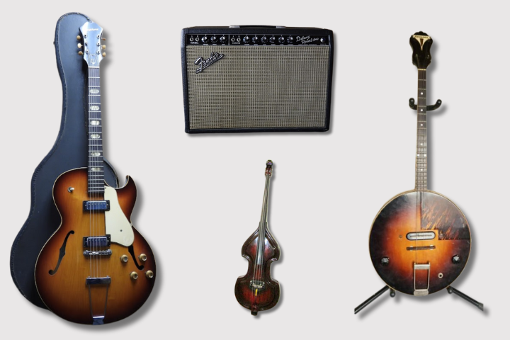Beyond guitars, our auctions often include mandolins, ukuleles, bass guitars, violins, amplifiers, pedals, and other essential equipment. Many items come with fascinating histories, having graced recording studios, concert stages, or private collections. Visible details like aged finishes, vintage hardware, and natural wear make these instruments unique treasures that collectors and musicians appreciate.